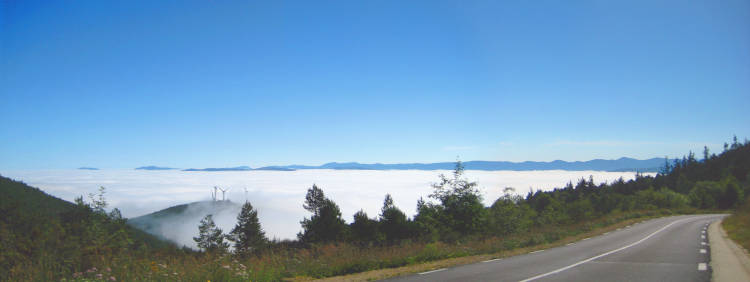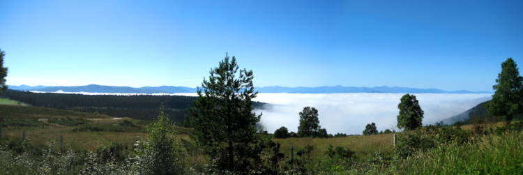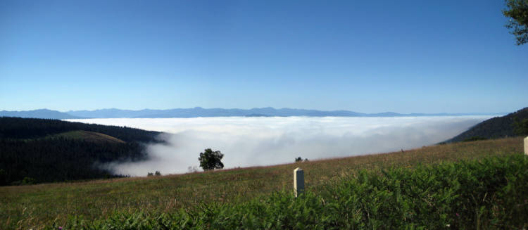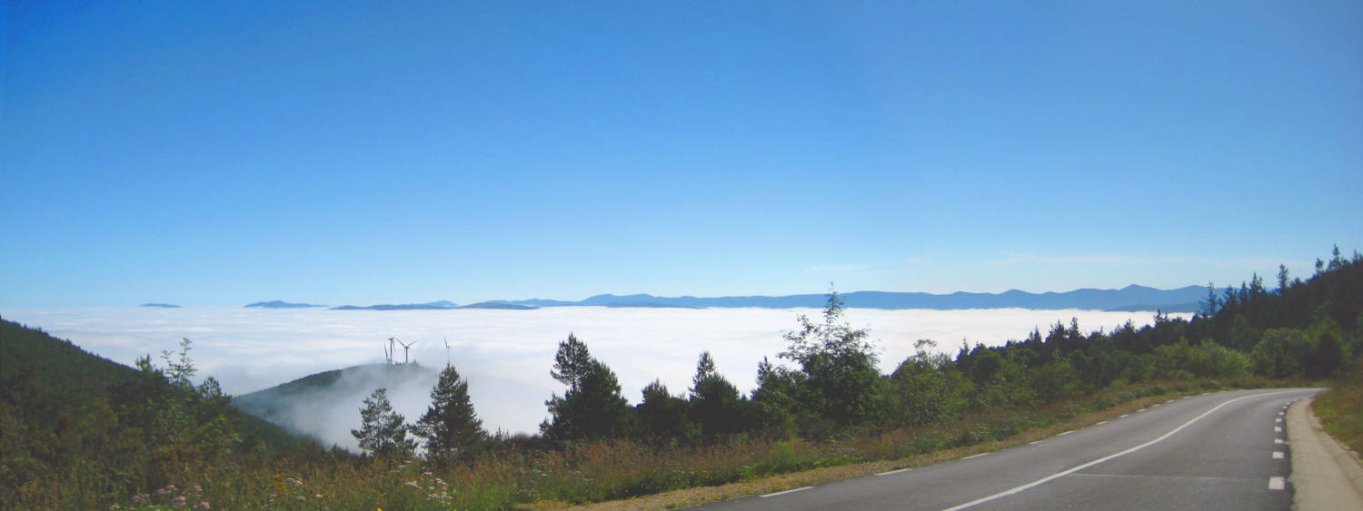 Around 11.15am Friday 5th July 2024 - unusual temperature inversions. Larger image (Above - from the high point above O Acebo - view towards Grandas de Salime & the Navia valley) Temperature inversions always put a smile on my face - I'm grateful they have chosen to put on a show; they always bring to mind Border Collie dogs - there is of course no logic to this. Although, having said that, I can draw a tenuous parallel by stating that, for example, 'temperature inversions visibly make the world a better place' and 'Border Collie dogs visibly make the world a better place', now, some contentious people might suggest that 'Border Collies do not make the world a better place as far as the sheep are concerned' however while this point may 'appear' to have a degree of validity it does not do so precisely because the sheep will end in the butcher's shop with or without the intervention of the Border Collies, and further, by dint of their chivvying of the sheep - who are innately inclined to 'static' browsing and therefore prone to a considerable variety of ailments resulting from an overly sedentary lifestyle - the sheep are 'encouraged' to engage in a form of repeated physical activity which promotes benefits to all aspects of their physical, emotional and intellectual life, accepting, of course, that it doesn't - of itself - postpone the 'day of the butcher'. What? Are you suggesting that sheep do not have an intellectual life? What 'heresy' is this? Surely even you, of all apparently 'thinking' entities, understand that these noble Ruminants are so called precisely because they RUMINATE! Recall, if you will, that in the oft-repeated empirically established Theocratic Laws of The Sheep, when the Splin of Akle authored - through the medium of thought reflected from a mirror woven of bay leaves, snow, wintergreen and mustard seeds - the entirety of all living things, it was only to Humans - so called - that the Splin of Akle gave the indissoluble gift of hubristic confusion (without remission)! What - what now? What are you cavilling about now? What do you mean you don't agree that 'temperature inversions visibly make the world a better place'? Because what? Because 'someone might be getting wet............!' Really.....? Good grief! I think I'll leave the 'dialogue' there - I've been reading Kierkegaard recently (specifically 'Fearing Knee-trembling') and am quite able to generate screeds of intricate reasoning in proposing to define the essential nature of a grain of sand using the full 'Heinz' 57 arguments, forwards, backwards, Knight's move, semiotics, semolina and wintergreen woven from a thought-mirror of finest Splinofakle! Larger image (Above - from O Carbalin looking towards the mountains of Asturias and Leon) Normally a temperature inversion has cloud down to ground level - consequently I usually set off in 'heavy mist' - on this particular morning there was thick low cloud down to around 700 metres above sea level or thereabouts. That is to say more or less 300 metres above my house. All the indications on the way up suggested 'low cloud, possibly rain in the offing' - there was enough moisture to require the use of windscreen wipers. Only when emerging into intense sunshine a little before O Carbalin did it become apparent this was not a 'possible rain' day. Even before passing behind O Carbalin it was apparent the valley was filled more completely than I've seen before. The usual route I take to and from 'town' goes over the pass of O Acebo, a little before I get to O Acebo there is a higher point, more or less the same height above sea level as Ben Nevis, which I have christened (for my own personal use) as 'The Ben Nevis Curve'. Between O Carbalin and the 'Ben Nevis' highpoint the vista towards Grandas de Salime was similarly filled nearly to the brim Immediately after the high point of 'The Ben Nevis Curve' the entire view East to South to West comes into sight. Virtually every time I have seen temperature inversions they have been isolated - typically one valley has one, most don't. Sometimes two valleys, very rarely three. When there are two or three they are generally not adjacent. Very occasionally there may be an agglomeration. This day was different - as far as I could see in every direction every valley was filled near to the brim with glowing white temperature inversions. I would like to have stopped and taken photos of this spectacularly beautiful sight, but on the way to town I didn't have time to spare - I needed to get a good parking spot outside the supermarket before it opened. On the way back I had a large quantity of frozen food, fresh fruit and vegetables with me. The humidity and air temperature up top was 'saunatic'* - by the time I'd taken the last photo the sweat from my forehead was running down my glasses, so stopping to take photos of all the other inversions was out of the question - great shame! Larger image (Above - a lower viewpoint at O Carbalin looking towards the mountains of Asturias and Leon) * Saunatic - Adjective, a mixture of temperature and humidity approximate to that found in a sauna. (If the word's not in the dictionary then I've just invented it.) |