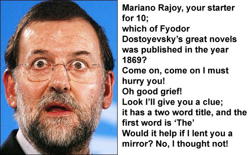 Indisputably the frontrunner by a mile in a field of one, Mariano Rajoy is only now being recognized. As the world's paramount impersonator of the late Benny Hill, Mariano has climbed to the peak, scaled the summit, and reached the dizzying heights of Benny Hill from whence he looks down on a vast following of adoring fans - and its not just the seagulls of the Partido Pajaro, but flocks of confused sheep, cattle chewing the cud, gangs of mendicant Francisco Tramps with their bulging envelopes, jobbing speechwriters' fabricators, liners of pockets, and so on. |